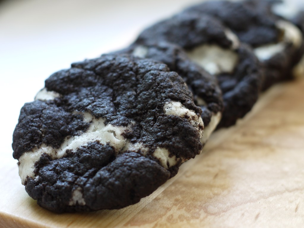 Or…what else can you do with Homemade Opera Cream? I had some opera cream in my freezer leftover from Easter (I never got around to making candy with it). I also had some black cocoa powder sitting in the pantry and was hankering for something that tasted like that famous cocoa and cream sandwich cookie. Black cocoa snickerdoodles with a ball of opera cream inside baked just until set, Voila!
